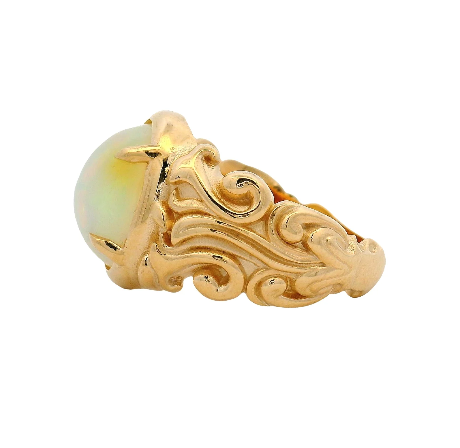 This ring captures the dreamlike glow of Starry Night, with an ornate gold setting that echoes Van Gogh’s iconic, windswept brushstrokes and frames the opal center stone in sculptural detail. Due to natural variations, each gemstone will display its own unique character.