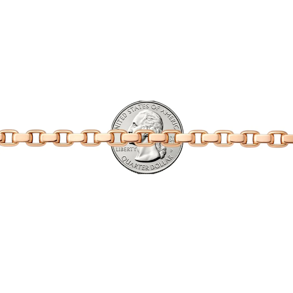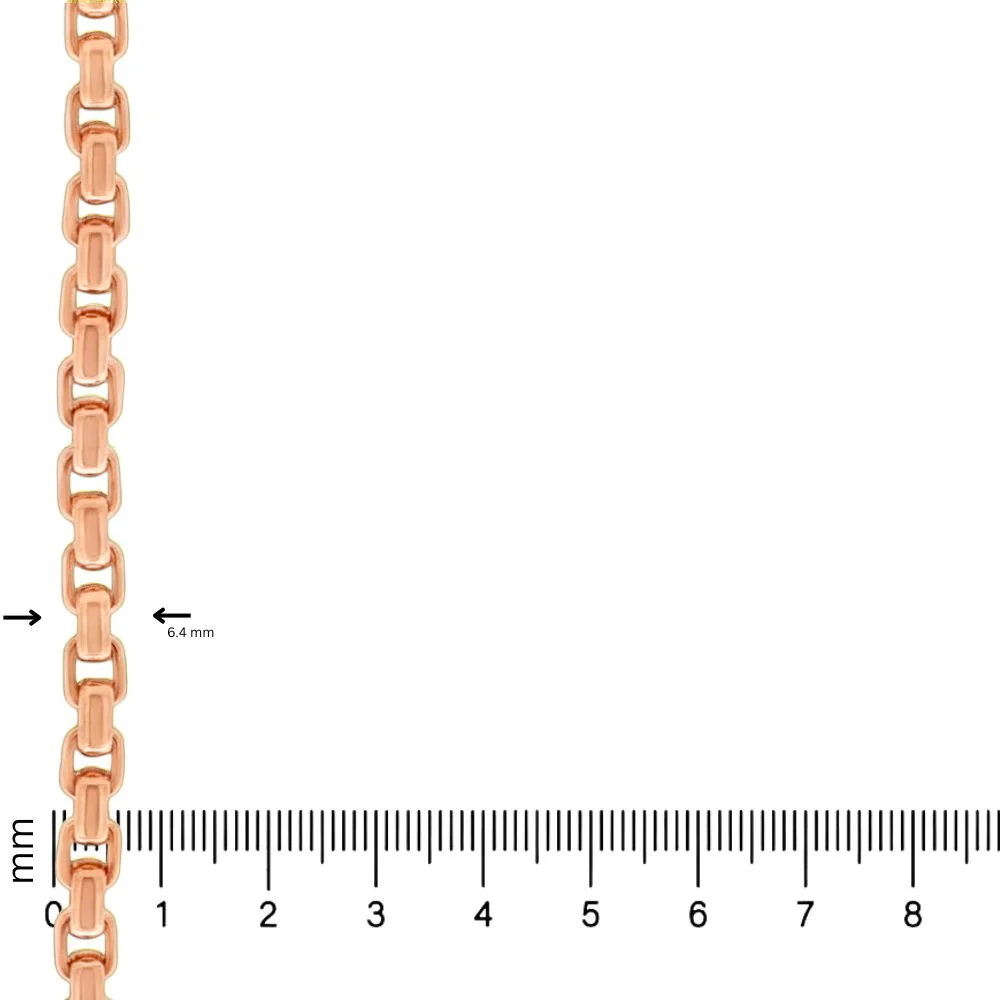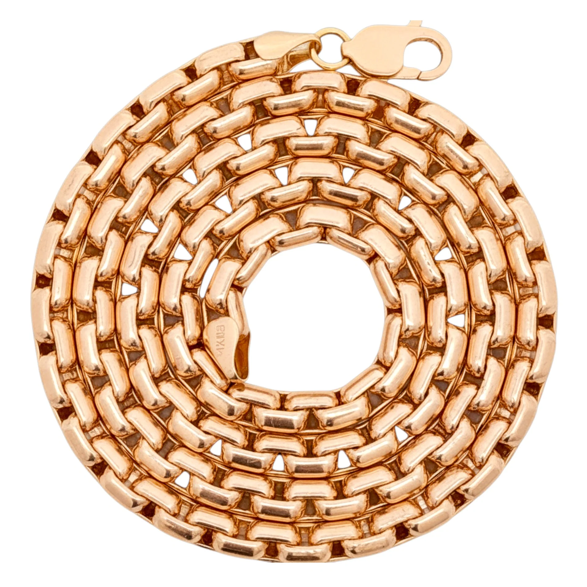 Experience luxury with this exceptional 14K rose gold chain. The commanding 6.4mm round box link design showcases superior craftsmanship and solid gold construction. Versatile enough to stand alone as a striking statement piece or serve as the perfect foundation for your favorite pendant, this chain delivers both presence and elegance. An investment in timeless beauty that transcends seasons and styles.