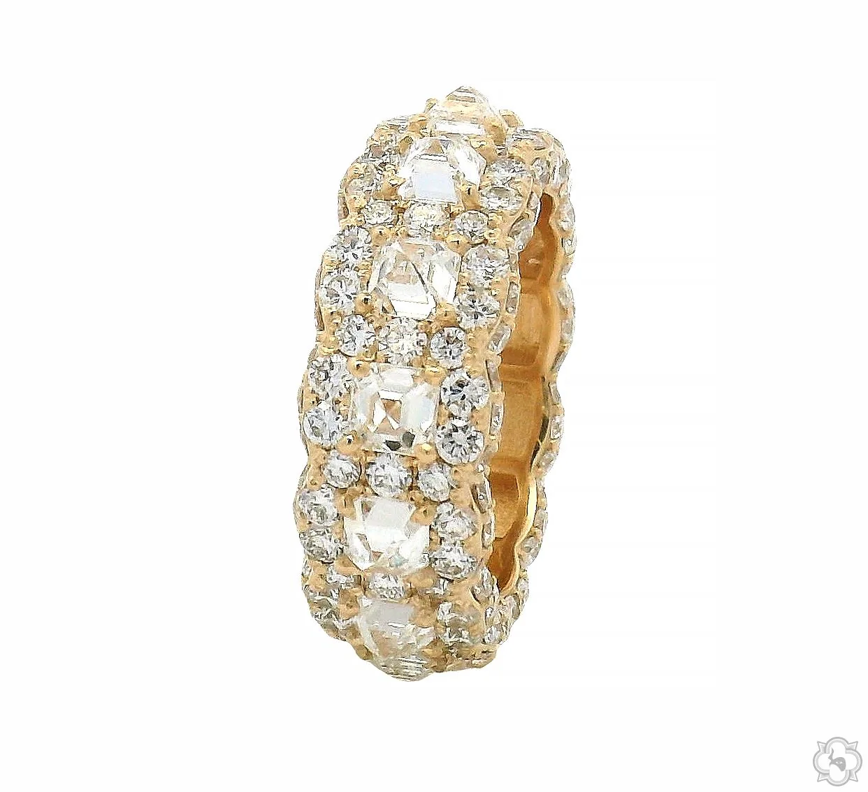 This bold eternity band showcases 25 pointer Asscher-cut diamonds set upside down, creating a unique play of light and depth. Framed with brilliant round diamonds, the design balances modern edge with timeless elegance. Crafted in warm yellow gold, it makes a powerful statement of luxury and individuality.