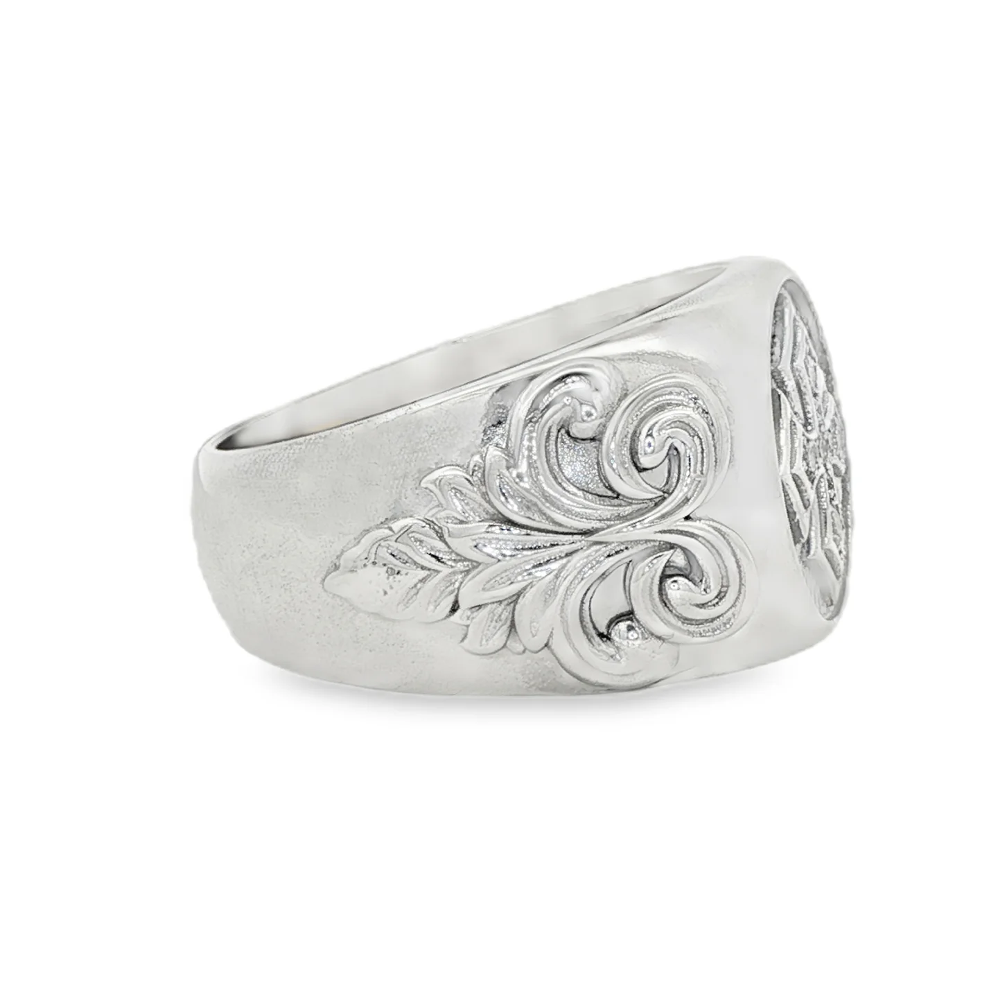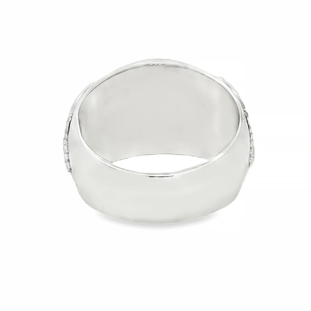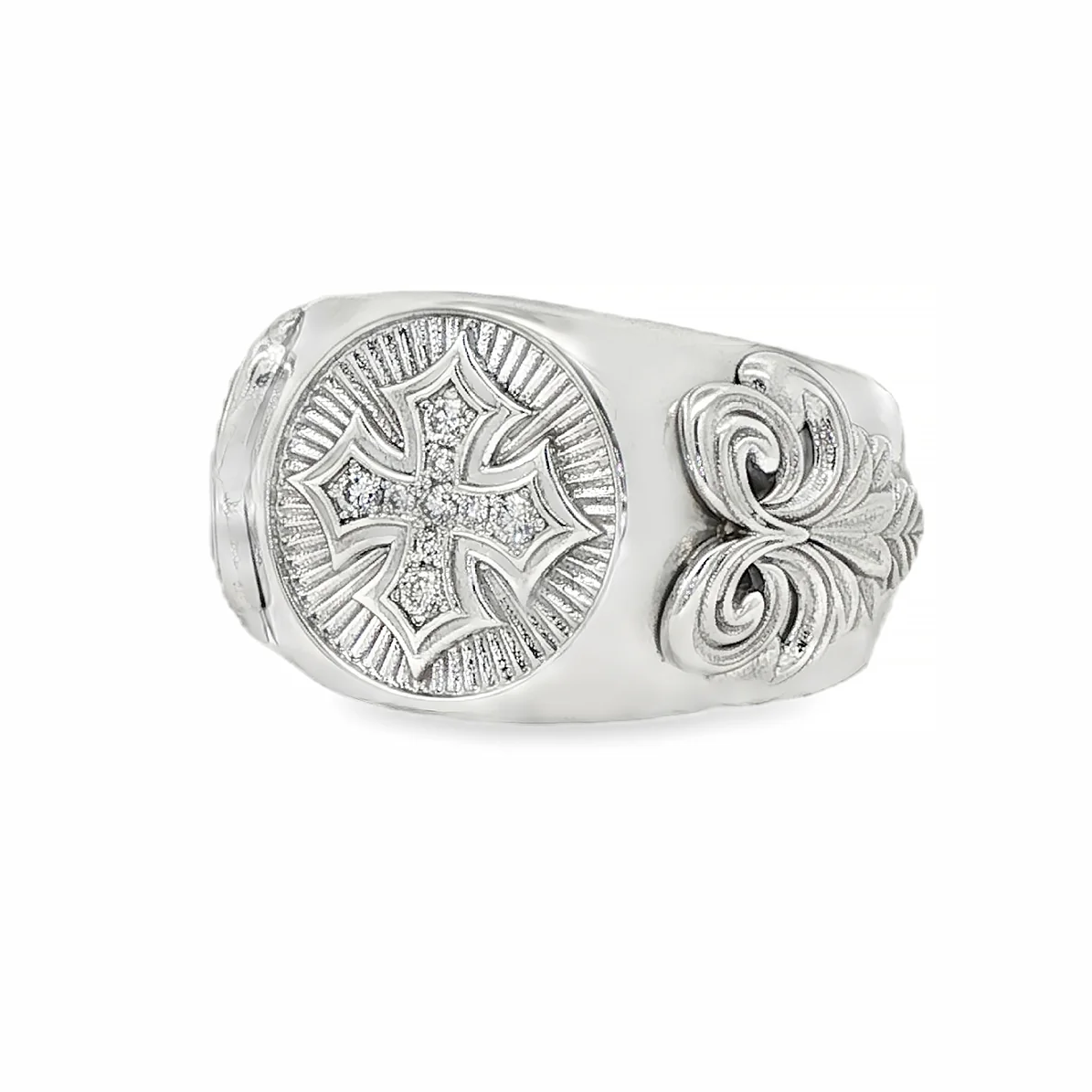 This ring features a sleek metallic finish with a detailed cross motif adorned with shimmering diamonds. Its bold yet refined design captures a sense of strength and sophistication, making it a timeless piece for everyday wear or statement styling.