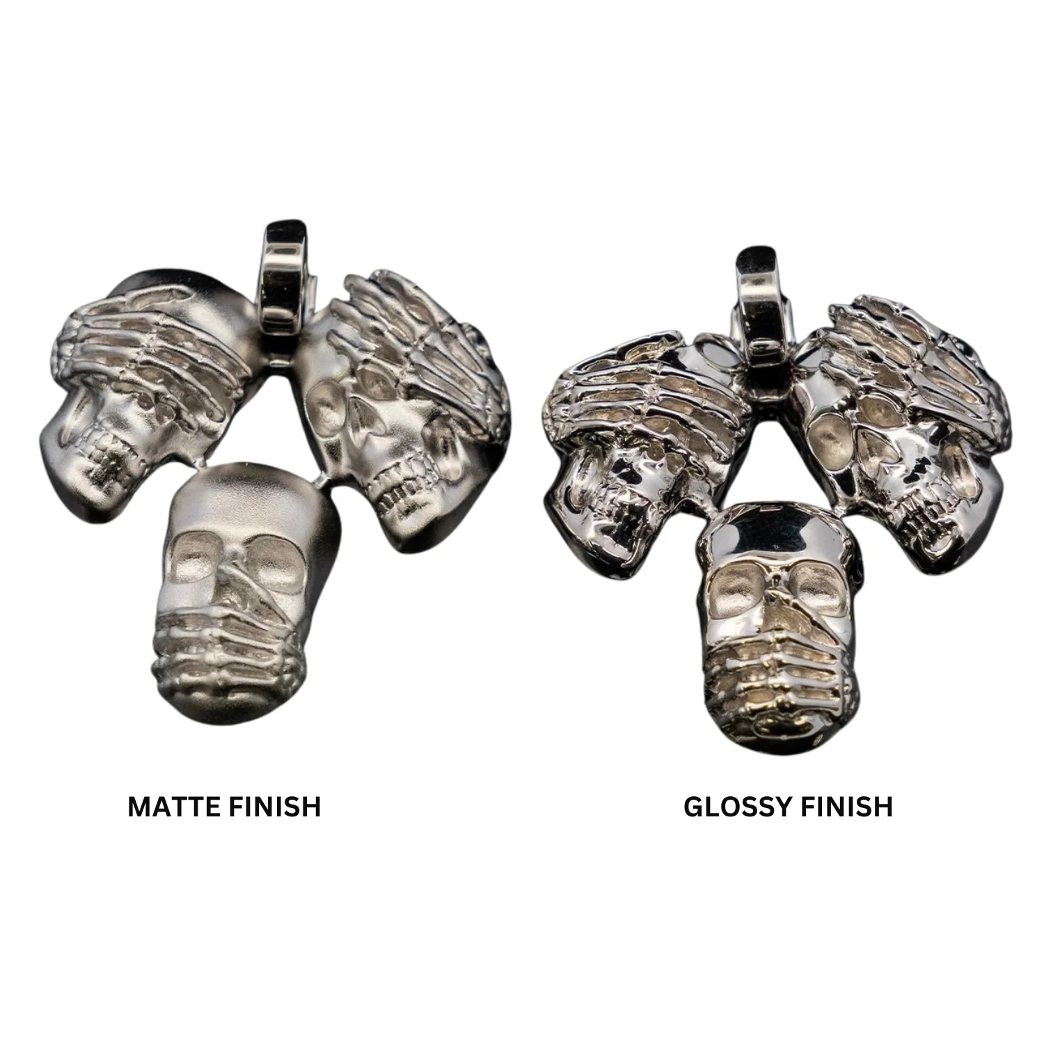 Embody the timeless “See No Evil, Hear No Evil, Speak No Evil” motif with this striking three-skull pendant, crafted in .925 sterling silver. Available in your choice of matte or glossy finish.