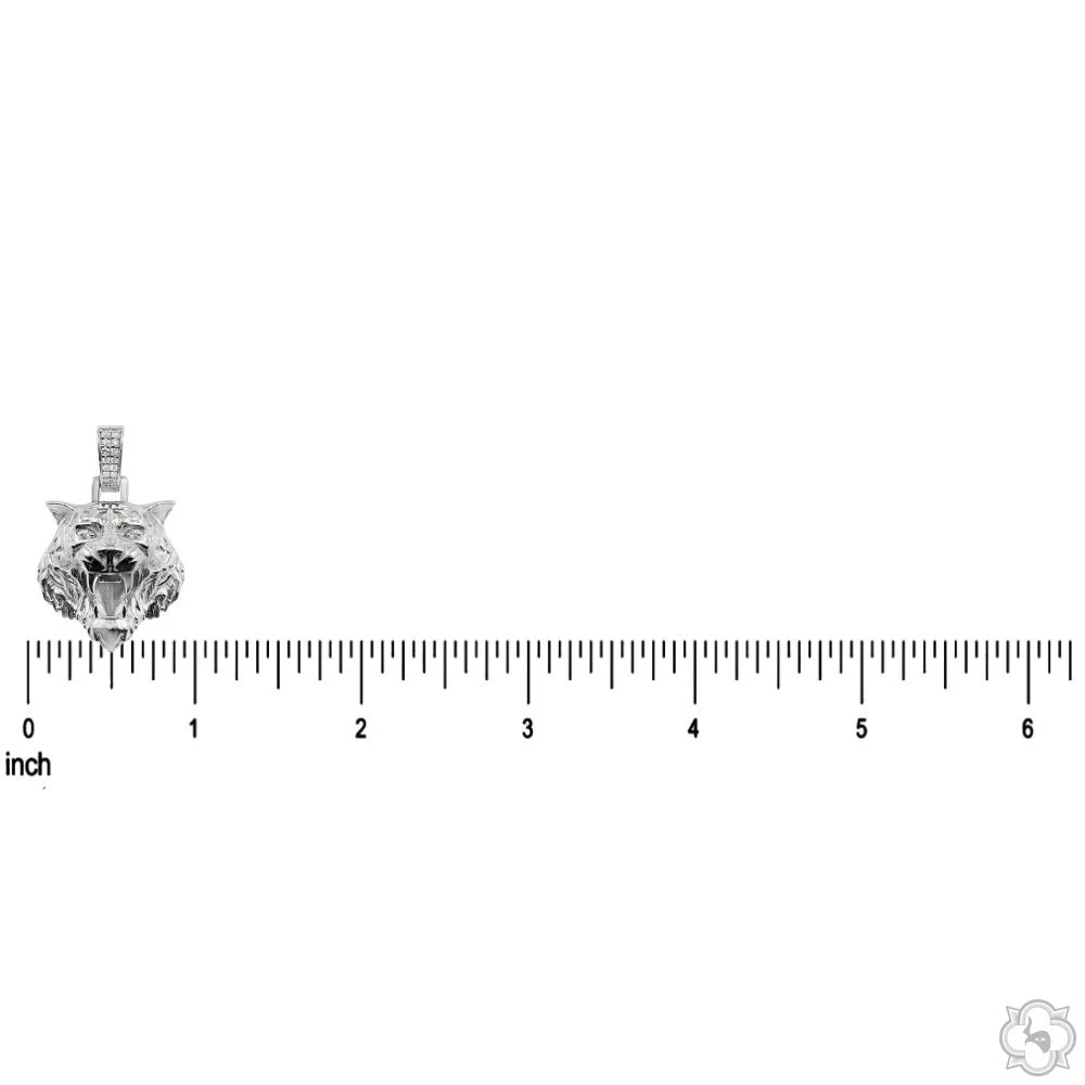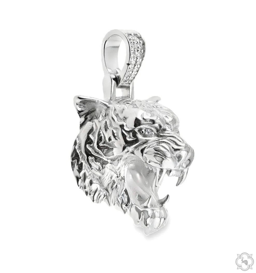 This pendant showcases a fierce and refined tiger head crafted from high polish 925 sterling silver. The eyes are accented with sparkling diamonds giving the piece a bold and captivating presence.\r\n\r\nWe offer custom options such as gold plating or other finishes to match your style. Contact us to create your own unique version.