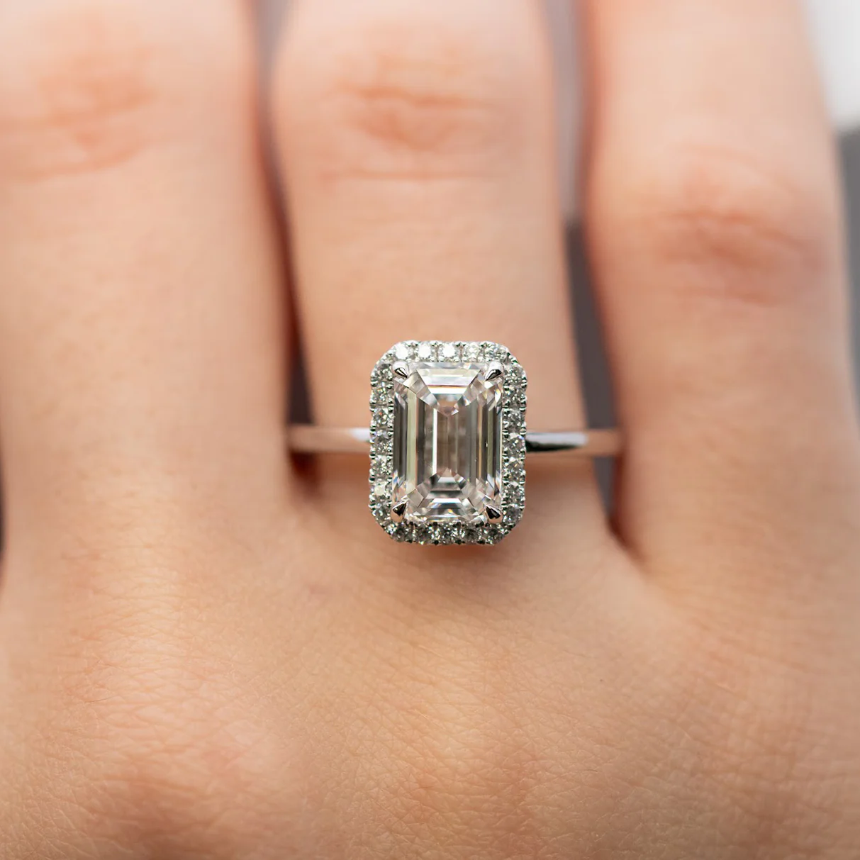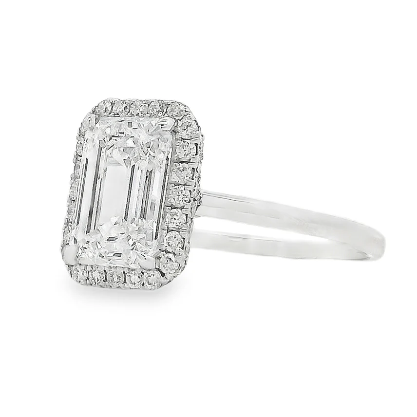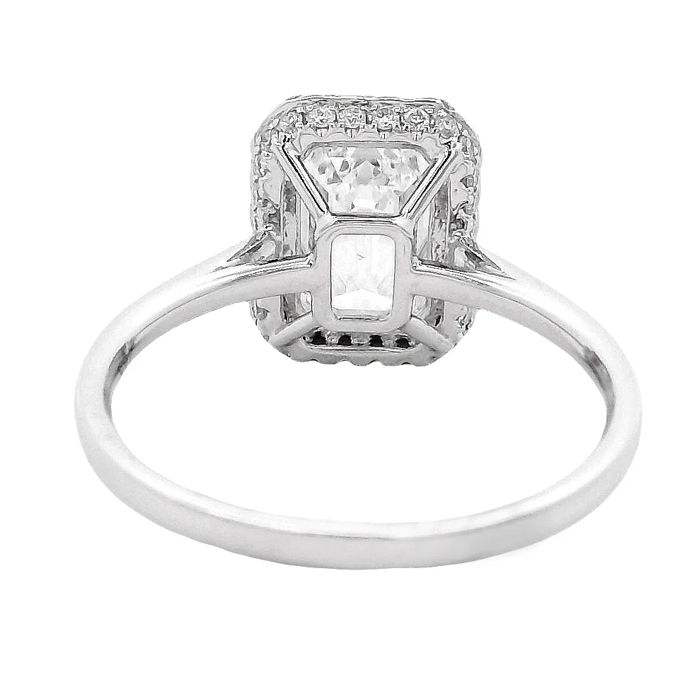 An emerald-cut diamond takes center stage, framed by a delicate halo that enhances its clean lines and brilliant depth. A refined and timeless design that delivers effortless sophistication.