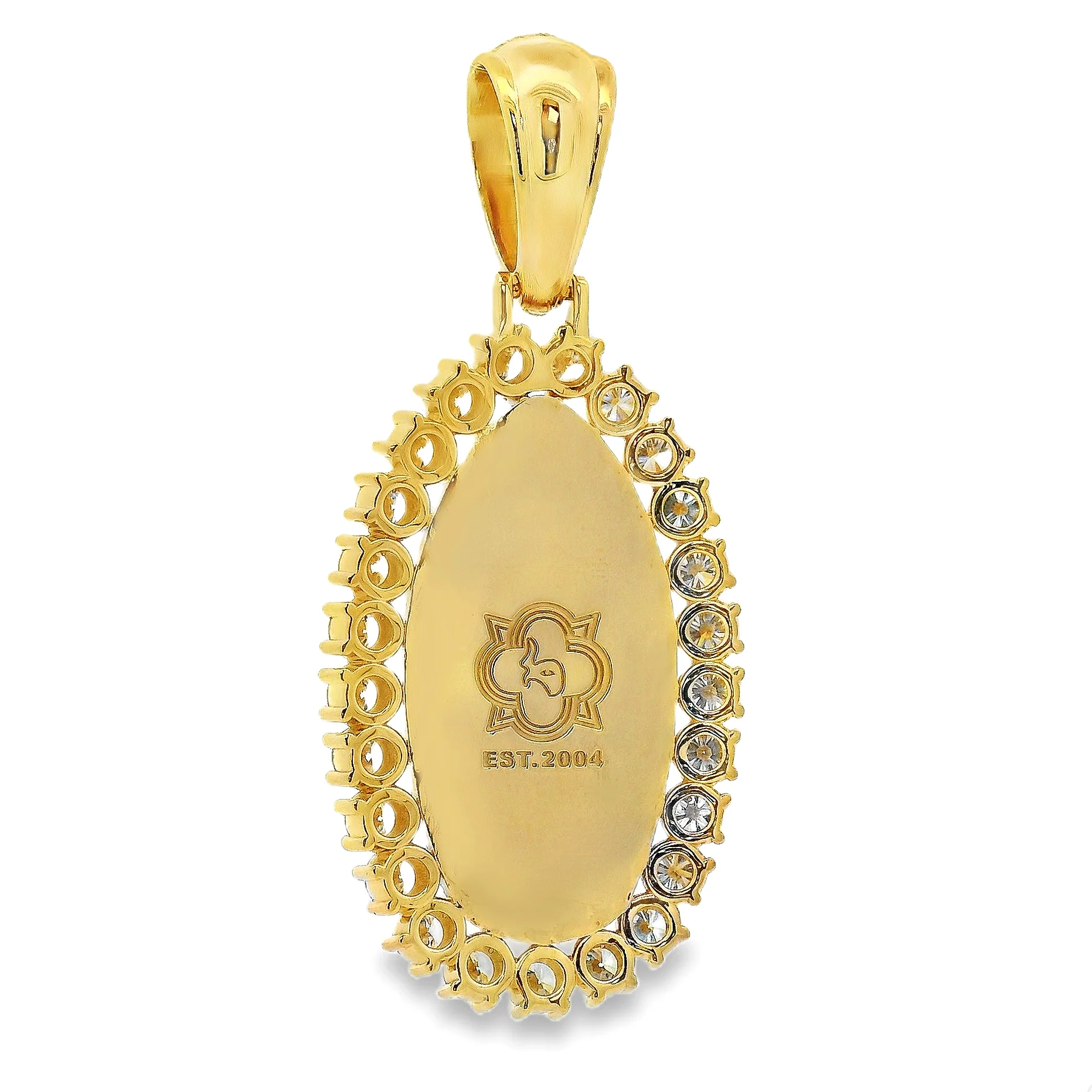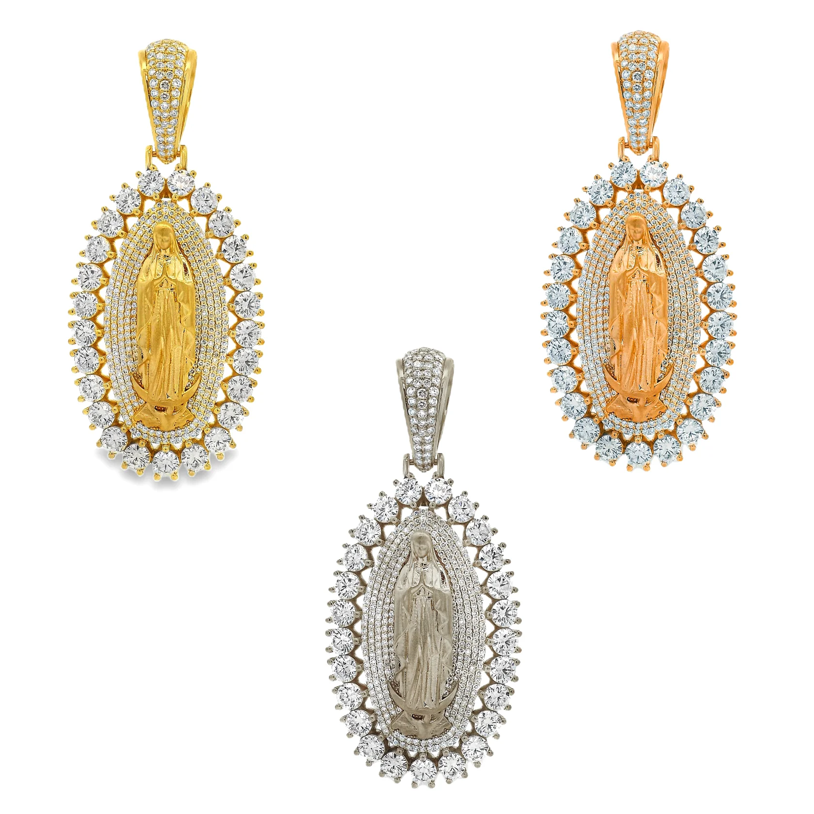 A beautifully crafted Virgin Mary pendant framed by a double halo of radiant diamonds. Designed to embody protection, faith, and divine beauty, this piece shines with timeless spiritual elegance.