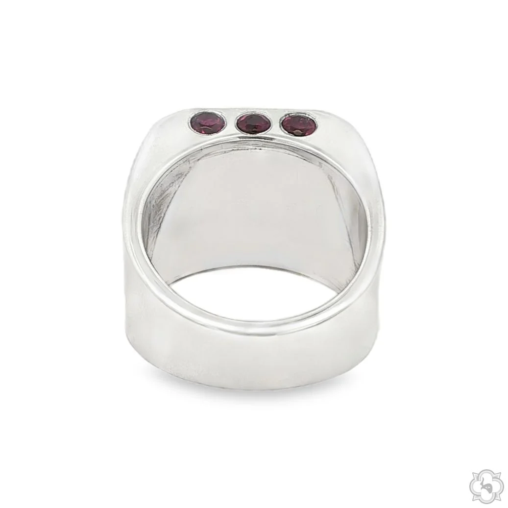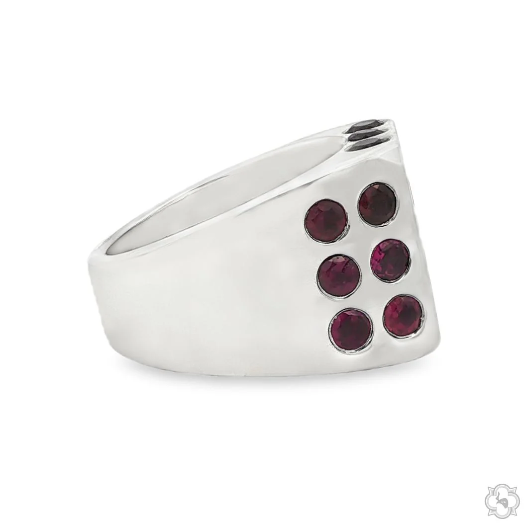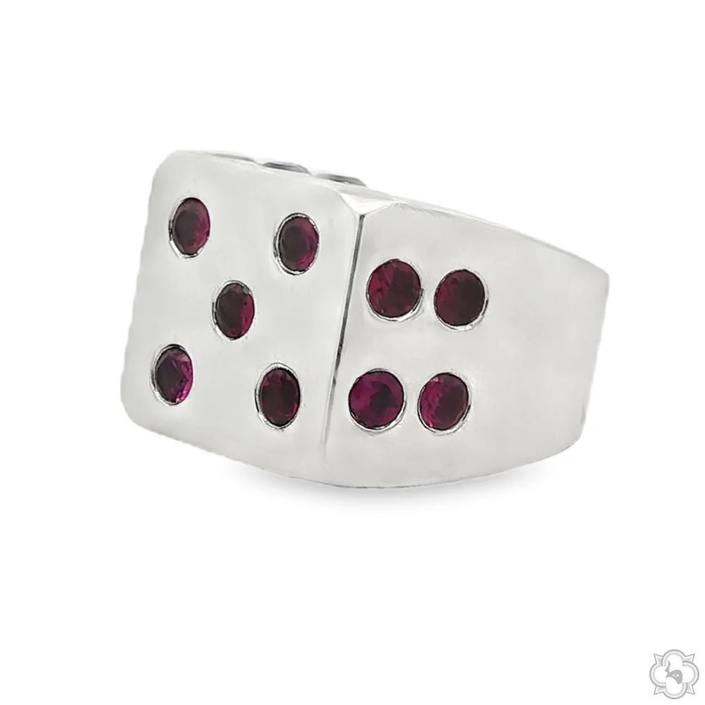 This bold ring showcases a detailed dice design set with vibrant rhodolite for a striking touch of color. A symbol of luck and confidence, it blends playful spirit with refined craftsmanship. A standout piece made for those who take bold chances in style.