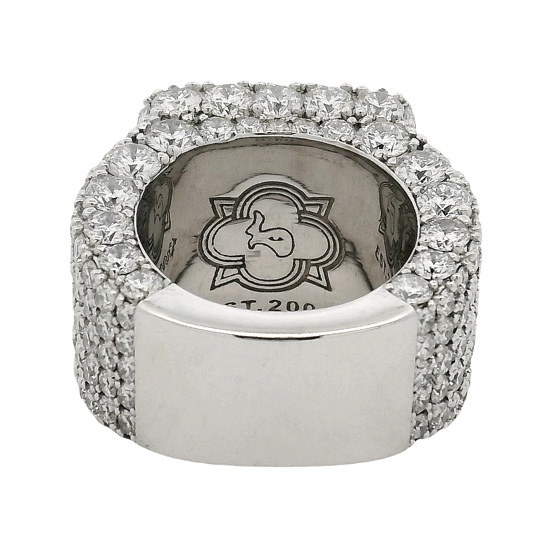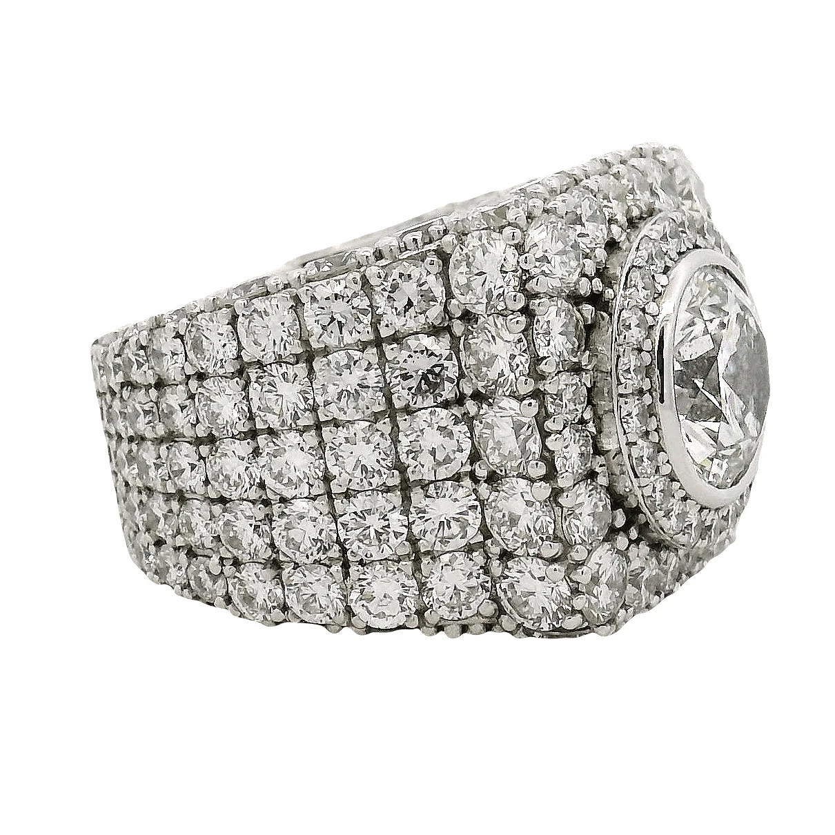 A commanding diamond ring designed to steal every spotlight. Centered with a bold round brilliant stone and layered in rows of radiant diamonds, this piece delivers unmatched presence and luxury—crafted for those who lead with confidence and elevate every room they enter.