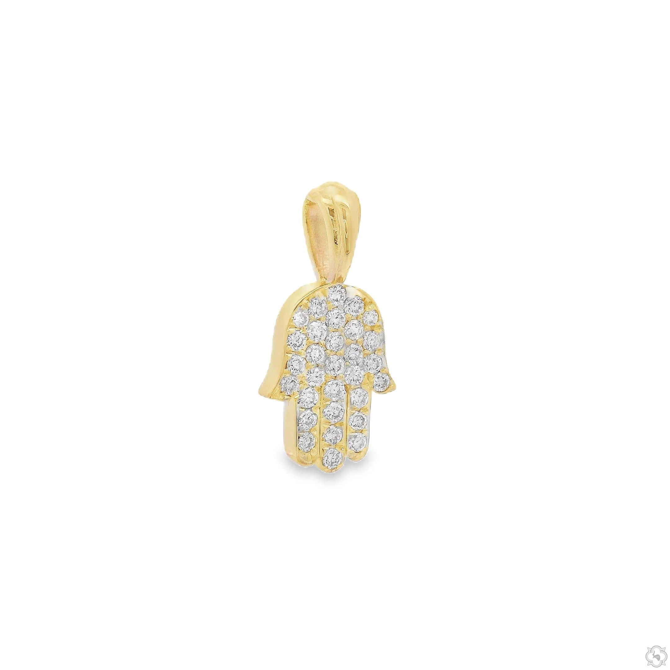 This pendant features a Hamsa design in gleaming yellow, rose or white gold, embellished with round brilliant cut diamonds. The diamonds showcase good polish and symmetry, adding a touch of elegance and spiritual significance to any ensemble. A timeless piece that radiates both beauty and positive energy.