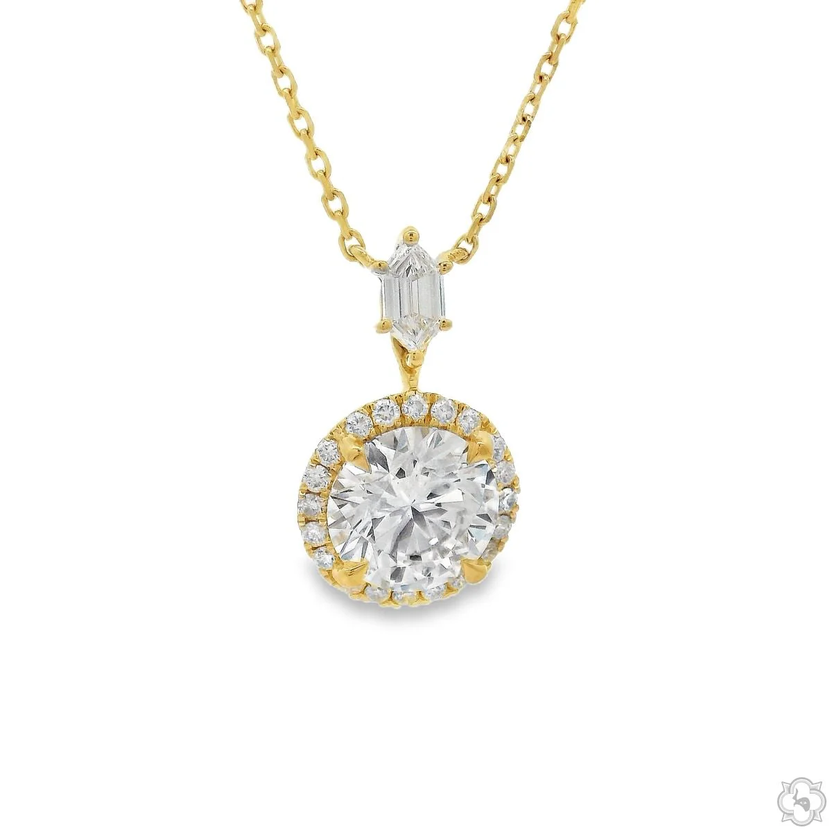 This elegant design features a dazzling round-cut center stone surrounded by a delicate halo of pavé diamonds, suspended from a brilliant baguette accent. The gold chain is adorned with bezel-set diamond stations, adding a graceful sparkle all around. Timeless, refined, and effortlessly radiant — this piece is perfect for elevating both everyday and evening looks.