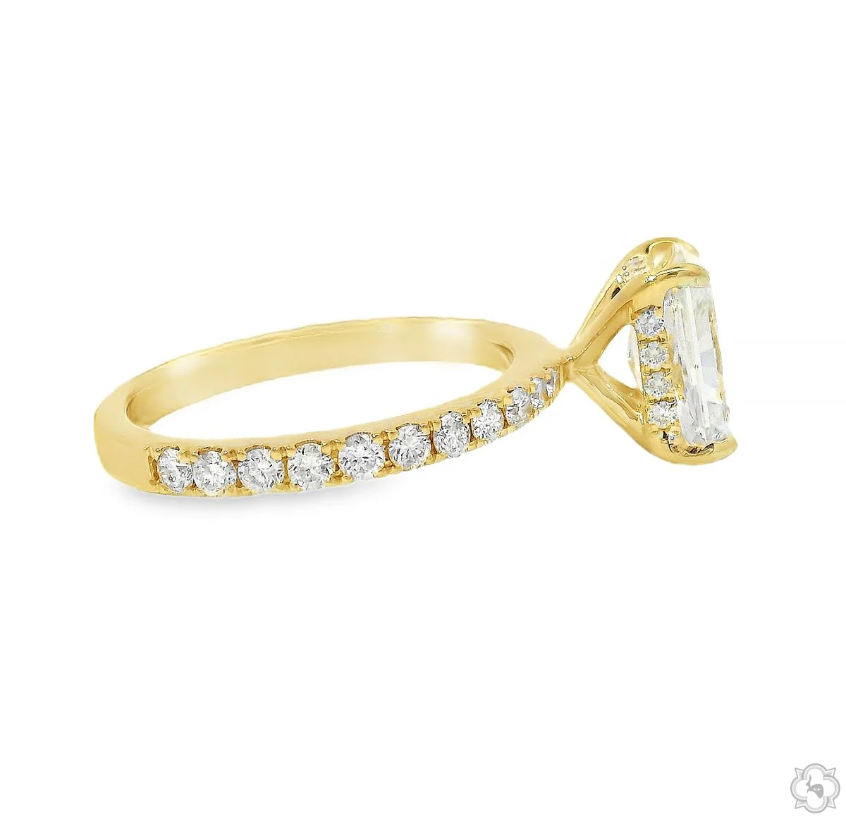 A timeless design with an edge of brilliance. This radiant-cut diamond sits front and center in a sleek silhouette, enhanced by a row of shimmering stones along the band. Designed to catch light and admiration from every angle.