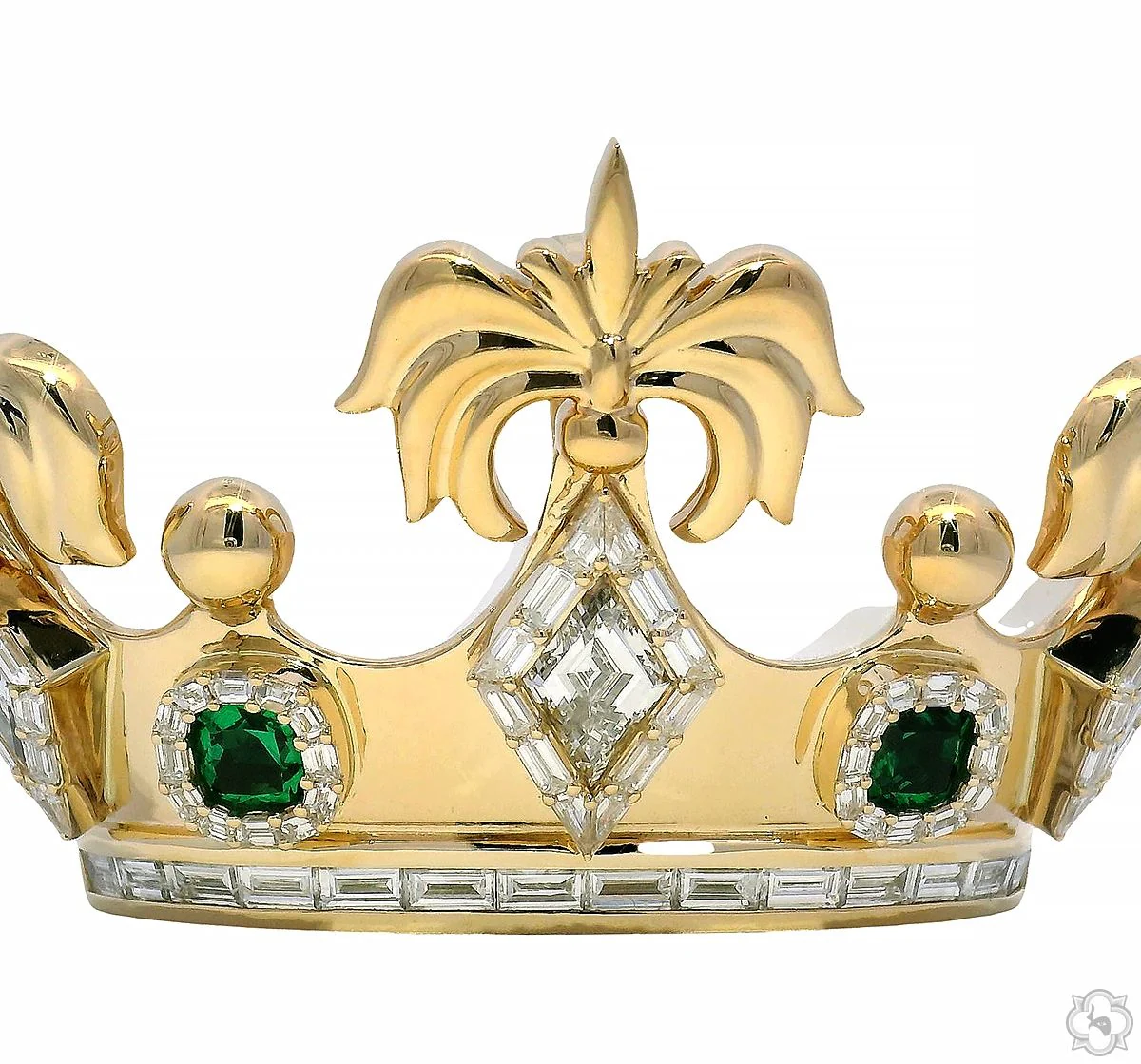This majestic crown pendant shines with dazzling diamonds and vibrant emeralds for a regal touch. Its intricate design captures the elegance and power of royalty. A bold statement piece that commands attention and admiration.