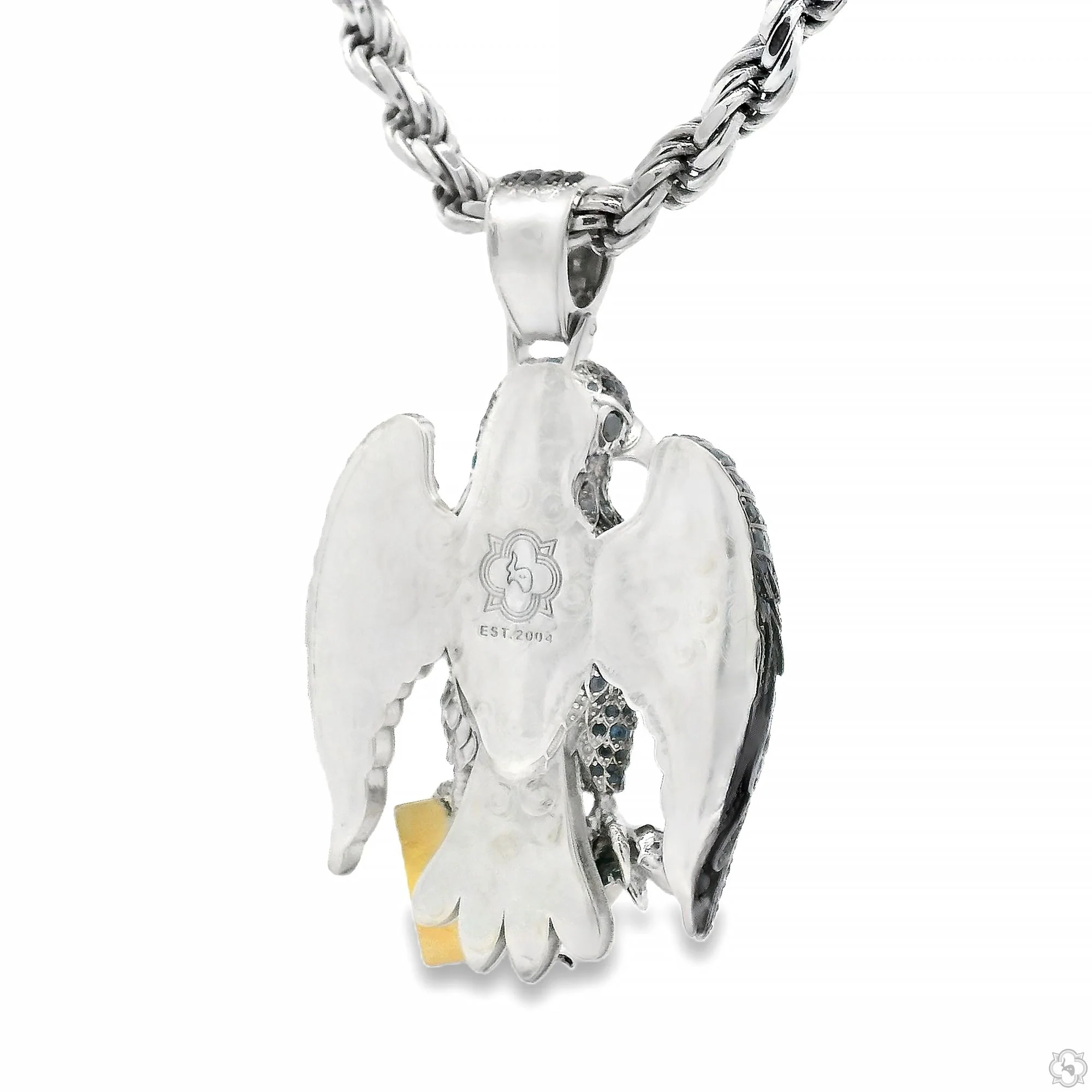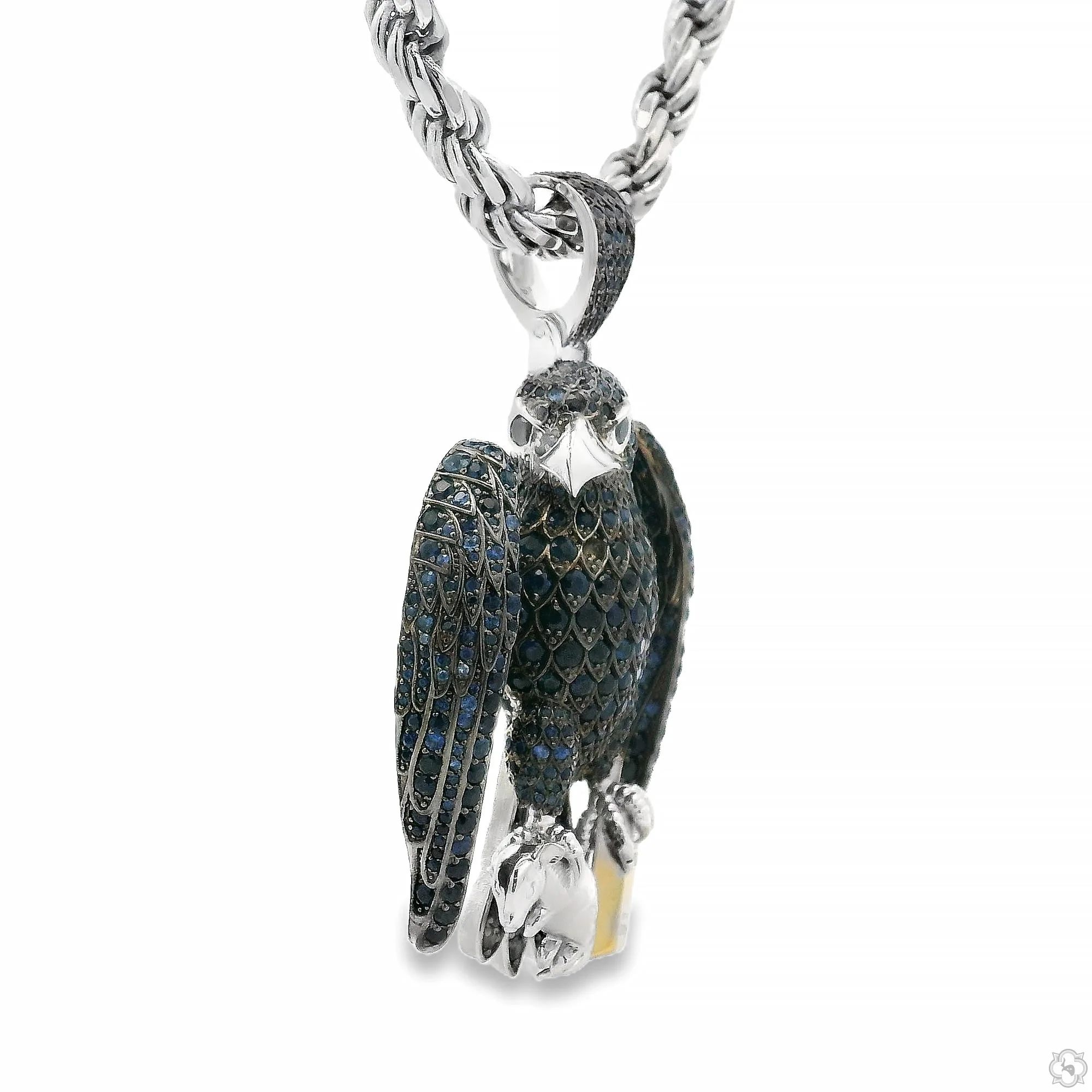 This striking hawk pendant is encrusted with deep blue sapphires, showcasing strength and precision in its design. The detailed craftsmanship captures the hawk clutching treasures, a symbol of power and triumph. A bold statement piece made to inspire confidence and style.