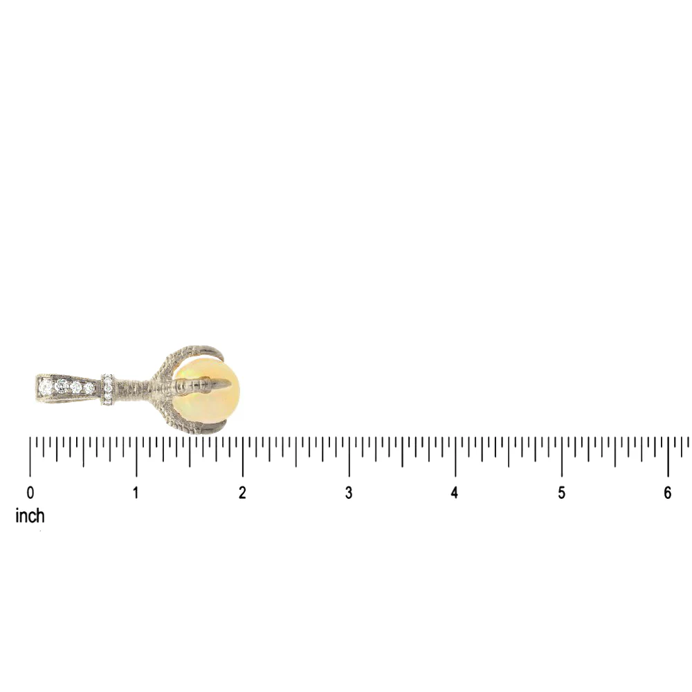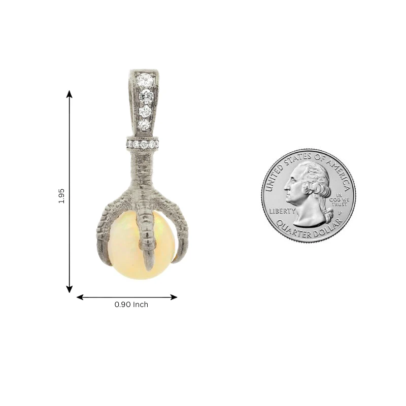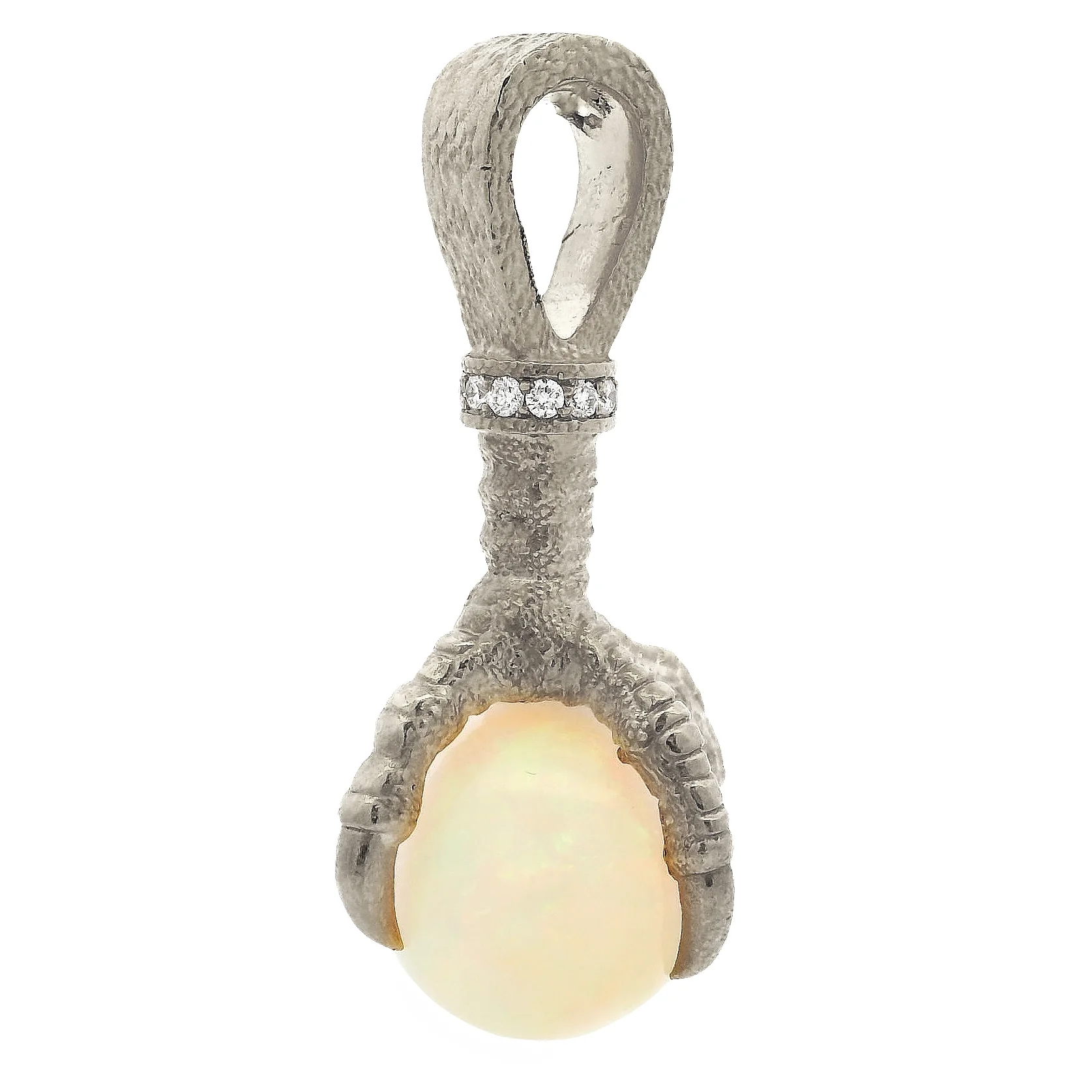 This pendant features a detailed eagle claw cast in .925 silver, firmly holding a polished opal sphere. The bale is accented with brilliant-cut diamonds, adding refined sparkle to the bold, sculptural design. A striking piece that blends fine craftsmanship with a powerful, natural motif.