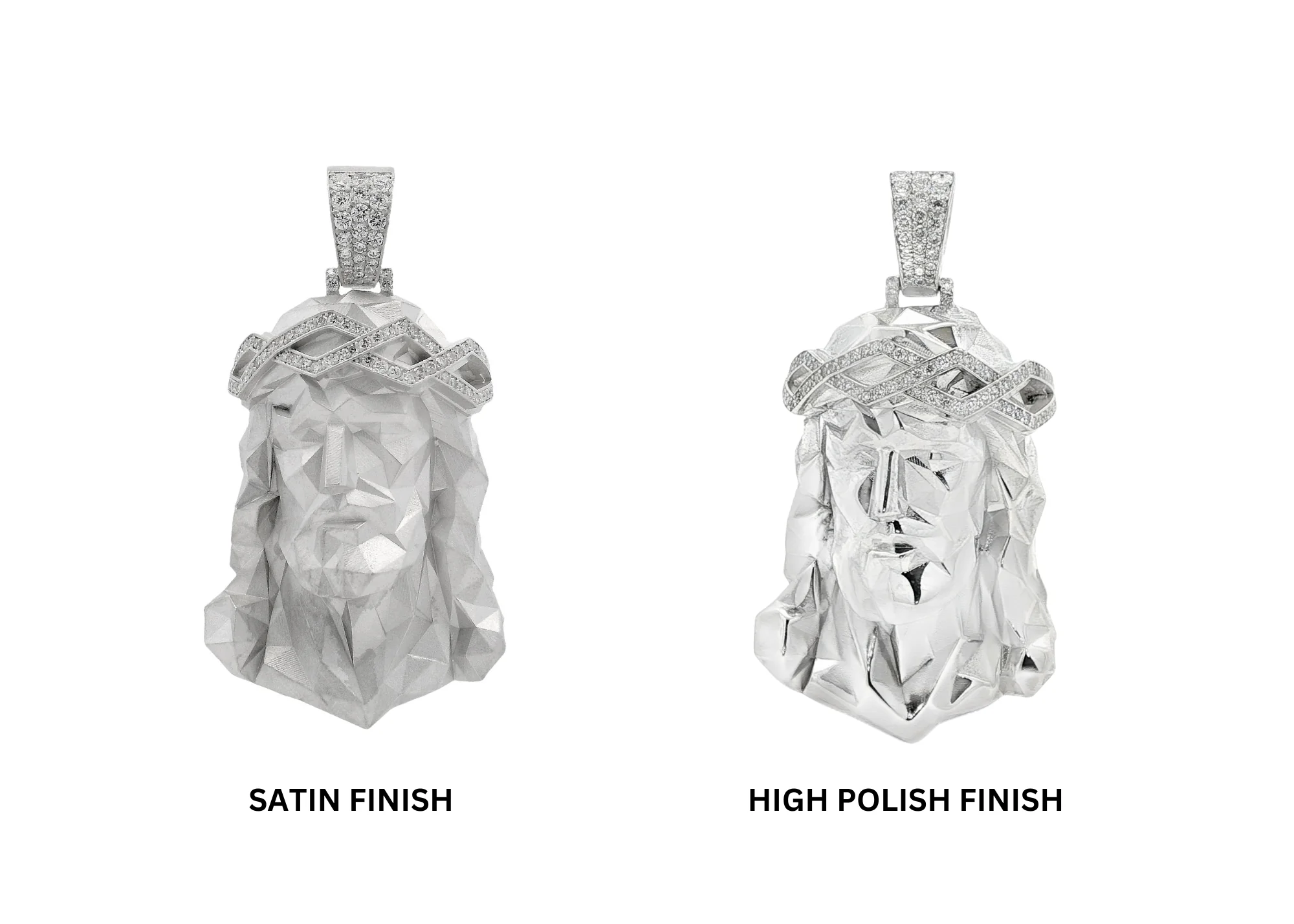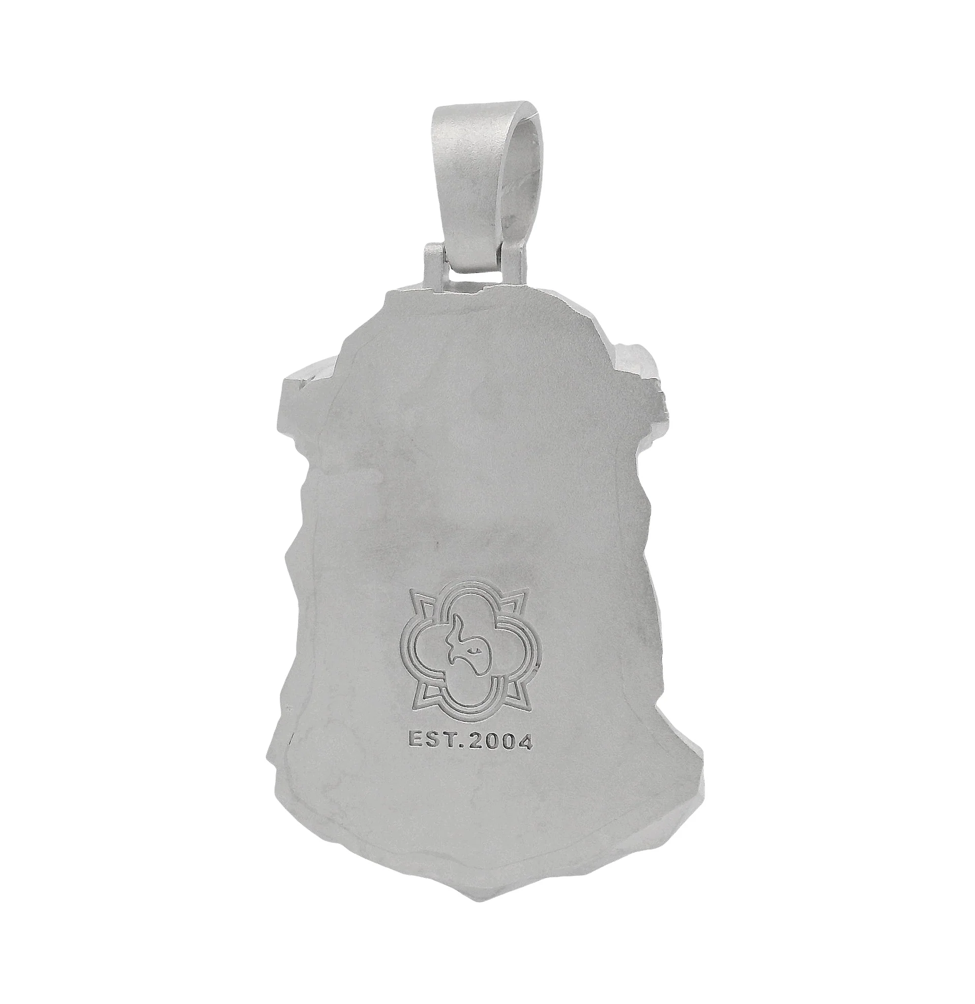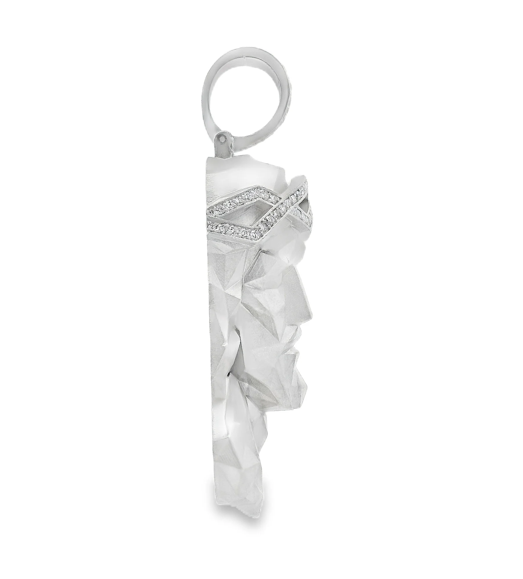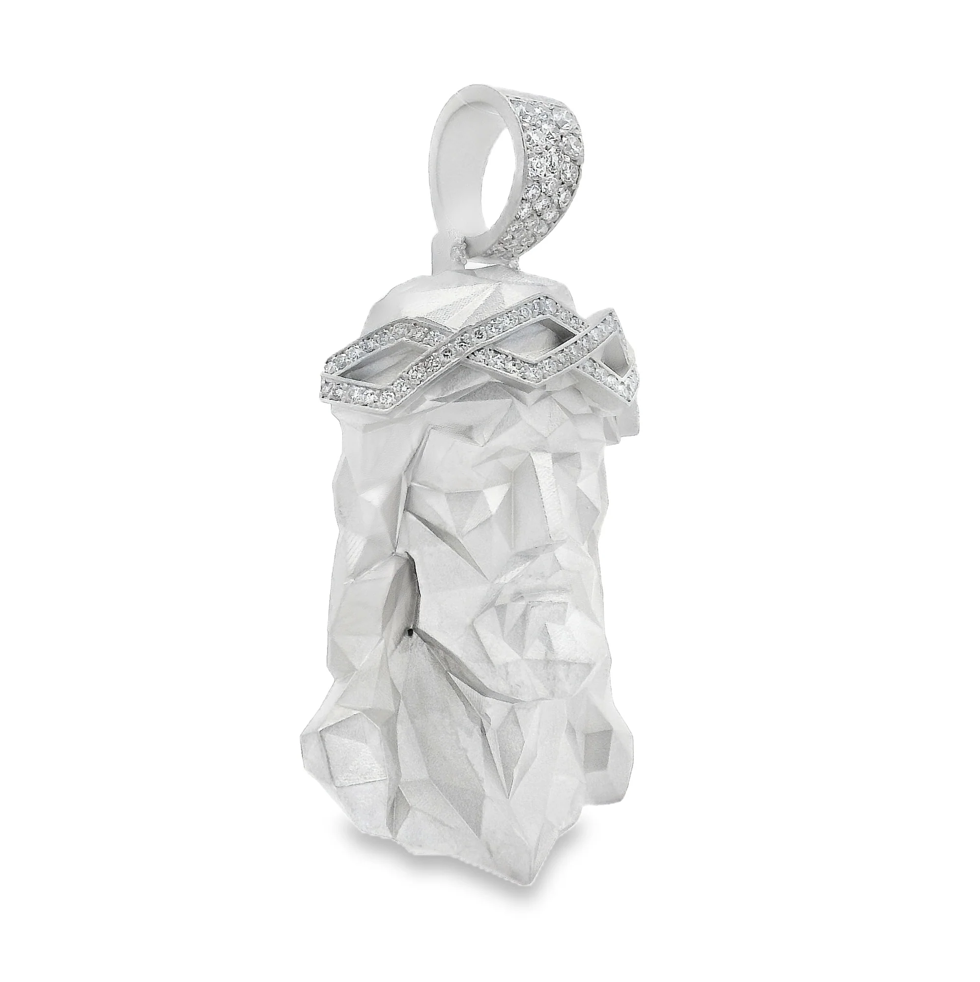 A modern reimagining of a Jesus piece, this pendant draws inspiration from stealth bomber technology with sharp, faceted geometry and a low-profile, futuristic finish. Crafted in silver and accented with natural diamonds, it balances sacred symbolism with advanced design.