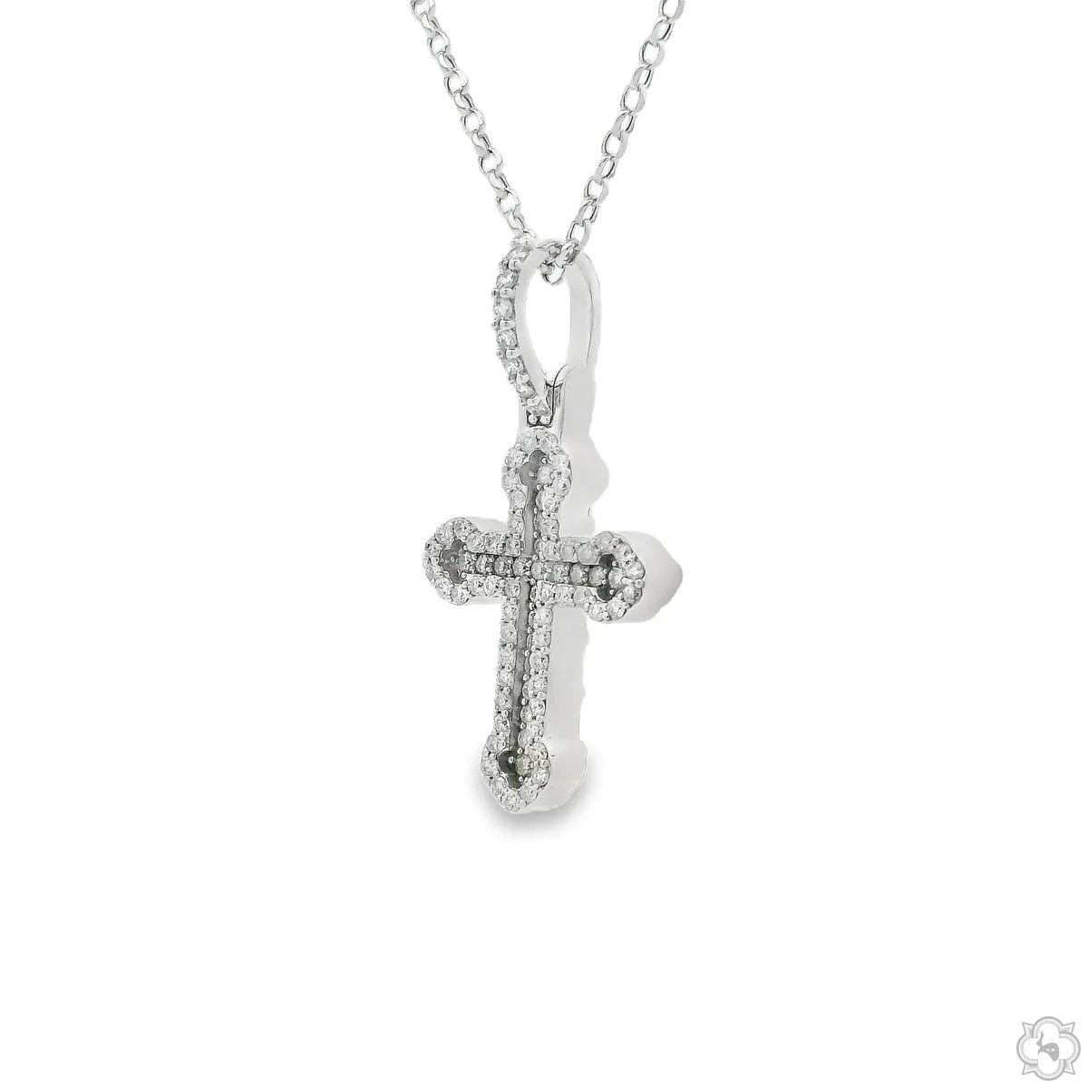 This radiant pendant showcases a bold cross design covered in shimmering stones that catch the light from every angle. The detailed craftsmanship gives it a refined yet powerful look, perfect for any style. Completed with a matching chain, it brings a timeless symbol of faith and elegance together in one striking piece.