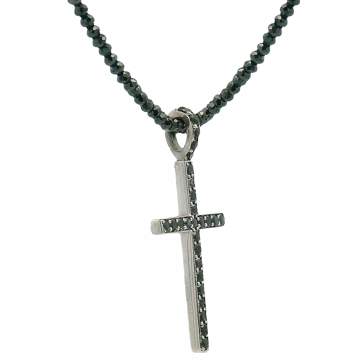 Sleek and refined, this cross pendant set with black diamonds radiates bold sophistication. Paired with a matching beaded chain, it captures the essence of modern elegance with a dark, timeless edge.