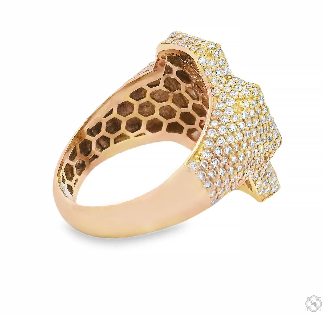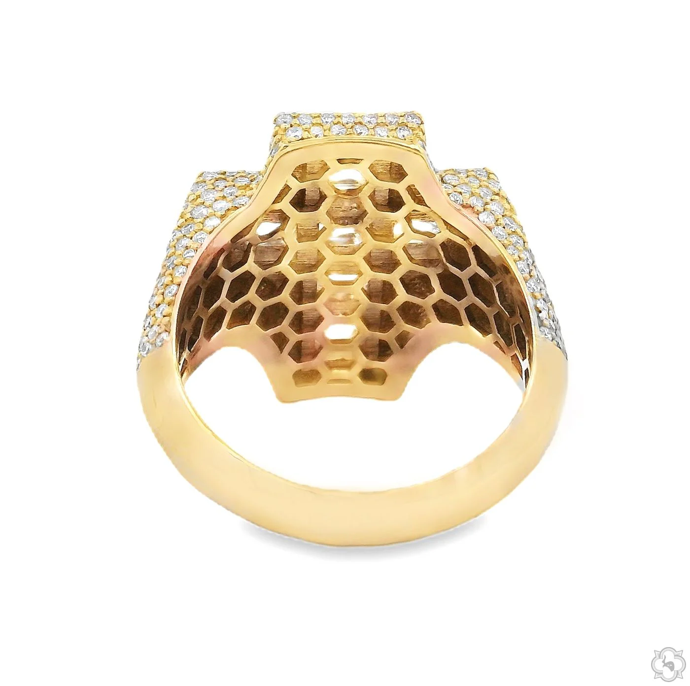This distinctive ring showcases Asscher-cut diamonds set upside down, forming a bold and radiant cross motif. The unique inverted setting enhances the facets, creating a striking interplay of light and depth. Surrounded by a shimmering diamond halo, it is a statement of faith with a modern edge.